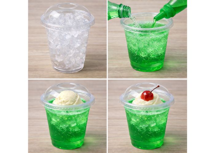 かき氷シロップでソーダを仕上げて、ポーションタイプのバニラアイスを使うことで、簡単オペレーションで提供できます。文化祭・キッチンカー・売店におすすめです。