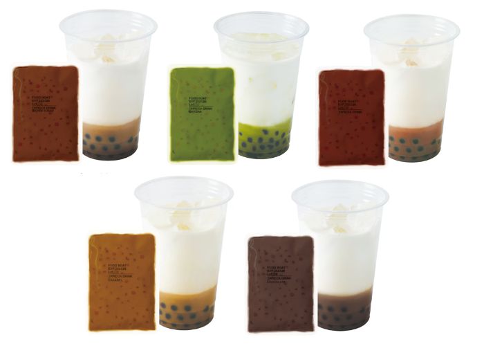 黒糖、抹茶、紅茶、キャラメル、チョコレートの5種類。タピオカに牛乳を注ぐと2層のタピオカドリンクが提供できます。