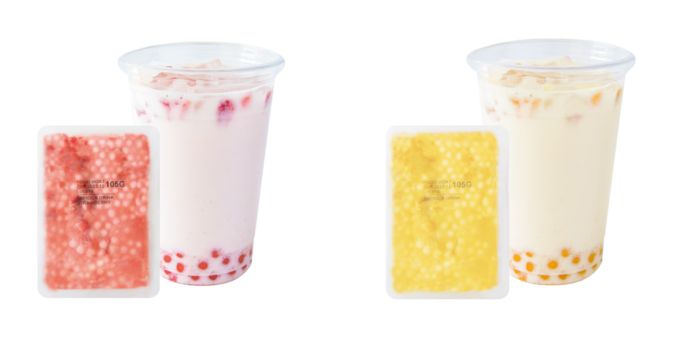 ストロベリーとマンゴーの2種類のフルーツタピオカ。タピオカに牛乳を注ぐと2層のタピオカドリンクが提供できます。