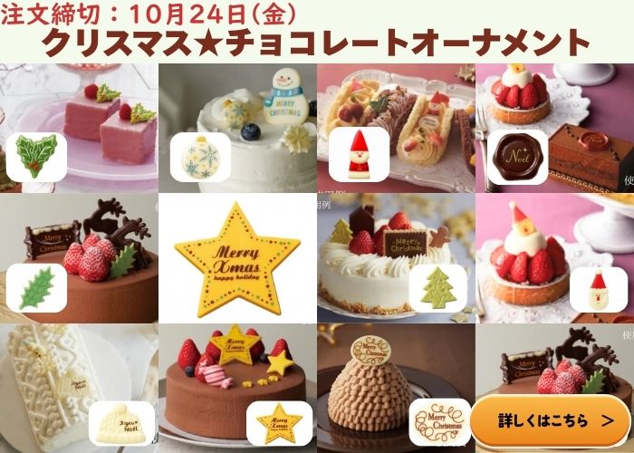 クリスマスに向けたご準備を、そろそろ本格的に始めていただく時期となりました。 ケーキやデザートを華やかに演出できる 「チョコレートオーナメント」 のご予約締切は 10月24日です。サンタやもみの木、プレートなどをケーキに飾るだけで、定番商品が一気にクリスマス仕様に変わります。 サンプルで現物をご確認のうえ、ぜひ早めのご注文をご検討ください。 ご予約の締め切りは 10月24日(金)。 納品は 10月14日~12月25日 の期間でご指定いただけます。 クリスマス菓子や業務用ケーキをまとめた 「クリスマススイーツ特集」 もご用意しています。小分け向け焼菓子、ギフトセット、ホールケーキやモンブラン、ラッピング資材、ピックなど、売場づくりに役立つアイテムを幅広くご紹介しています。 また、ケーキ製造が追いつかない・効率を上げたい方には、スポンジケーキやケーキ土台の仕入れをご提案しております。 |