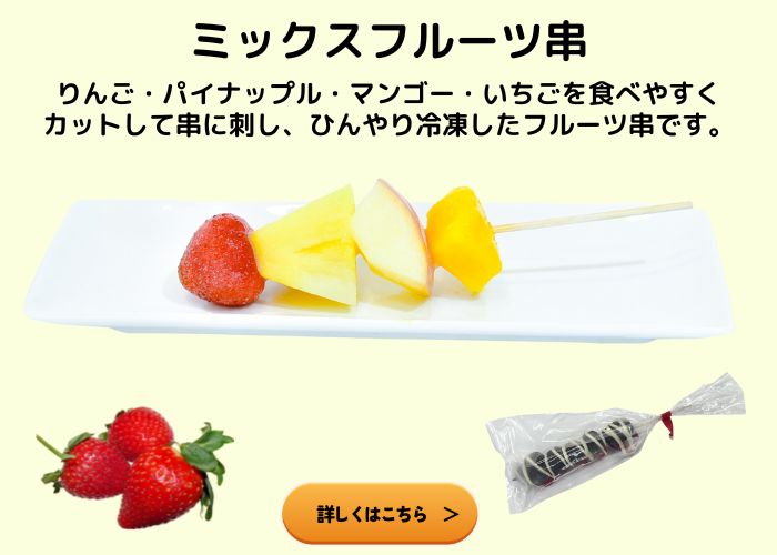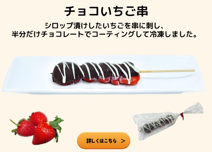 まだ暑さが残るこの季節。なごみやでは、ひんやり冷たいスイーツの人気が続いています。本日はイベントや屋台販売におすすめのフルーツ串をご紹介します。 まずは「チョコいちご串」。シロップ漬けした甘酸っぱい苺を串に刺し、半分だけチョコレートでコーティング。酸味と甘さのコントラストが抜群です。1本ずつ個包装になっているため、衛生的で提供も安心。見た目にも可愛らしく、イベントや屋台スイーツにぴったりの商品です。 続いて「ミックスフルーツ串」。りんご、パイナップル、マンゴー、苺を食べやすくカットして串に。冷凍のままシャーベット感覚で楽しめます。こちらも1本ずつ個包装されており、取り扱いがしやすく便利です。 こちらのメーカーでは、人気の冷凍スイーツを種類豊富に販売しています。 |