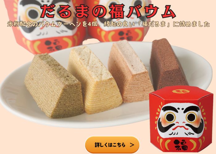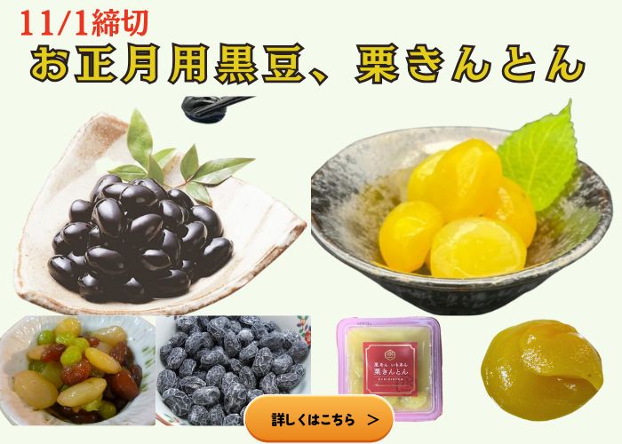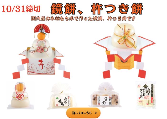 お正月商材のご注文締切が近づいてまいりましたので、改めてご案内させていただきます。 上生菓子、鏡餅、黒豆、栗きんとんなど、年末年始に欠かせない定番商品を取り揃えております。 各商品の締切日が異なりますので、お早めのご検討をお願いいたします。 また、通年販売の「切り餅」や「だるまの福バウム」も、お正月・お年賀の売場におすすめです。 1月の上生菓子注文締切:11月15日10:00まで 来年の干支、午にちなんだデザインの上生菓子もございます。 鏡餅注文締切:10月31日10:00まで 国内産の水稲もち米で作った鏡餅、杵つき餅をご用意しています。鏡餅は160gの小さなサイズから、1800gまで7種類からお選びいただけます。 黒豆・栗きんとん注文締切:11月1日10:00まで 黒豆は大粒丹波黒豆2L、3L、北海黒豆、中国産の黒豆の4種類がございます。栗きんとんは、そのまま販売できるパック入りをご用意しています。 タイ産のもち米粉を使用し、国内工場で製造した価格を抑えたお餅です。煮ても焼いても美味しくお召し上がりいただけます。通年販売のため、注文締切はございません。 米粉配合のバウムクーヘンをカラフルに4種類詰合せしました。洋菓子店、和菓子店におすすめです。通年販売商品のため、締切はありません。 |