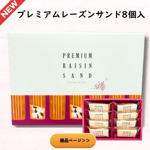 ラム酒香る大粒レーズンとホワイトチョコを挟んだ「プレミアムレーズンサンド」バラ、5個入、8個入をご紹介いたします。