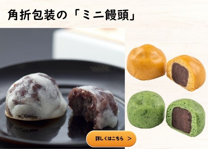 また、こちらのメーカーでは角折包装のミニ饅頭も販売しております。旅館など、宿泊施設のお茶菓子としておすすめです。