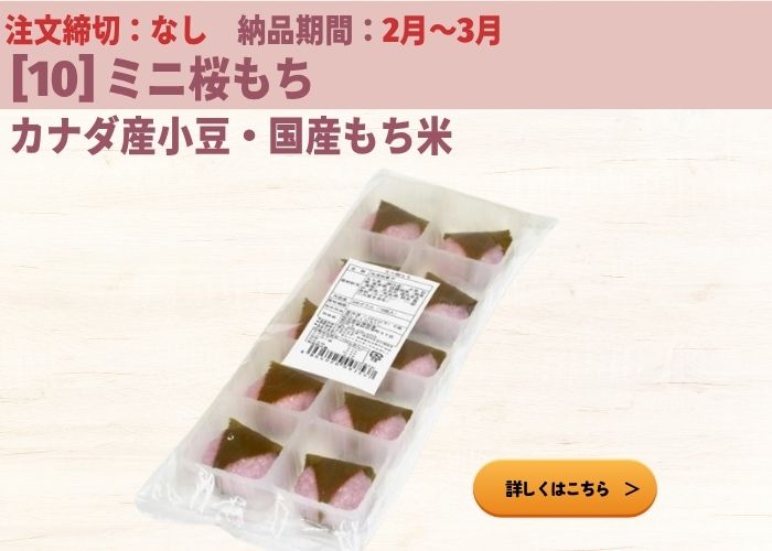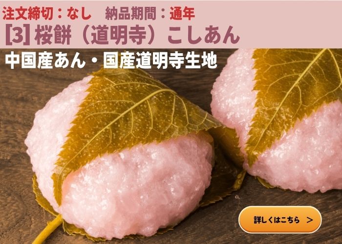 ピンク色が華やかで春を演出できる桜餅。ひな祭りや春のお彼岸、そして花見シーズンまで長く需要が続く定番の生菓子として、1月~4月に必須の品揃えとなります。なごみやで販売している桜餅は7種類・桜おはぎは2種類で、12月中に注文が必要な桜餅・桜おはぎもございます。サンプルのご手配も可能ですので、ぜひお早めにご検討をお願いいたします。 はじめて桜餅をご購入予定の方は、比較表も合わせてご参照ください。(画像・もしくは『比較表はこちら』ボタンクリックで遷移します) 国産もち米の道明寺生地で中国産のこしあんを包んだ60gの桜餅です。 予約注文は不要ですが例年2月~4月は注文数が増え、一時的に欠品することがございますので、納期に余裕を持ったご注文をお願いしております。 北海道産もち米と中国産のこしあんを使った75gの桜餅です。 2月納品注文締切:1月8日(木)10:00まで 3月納品注文締切:1月22日(木)10:00まで 注文の際には、納品期間内で配送希望日を選択してください。 国産もち米と北海道産のつぶあんを使った70gの桜餅です。 2月・3月納品注文締切:1月30日(金)10:00まで 注文の際には、納品期間内で配送希望日を選択してください。 ※サンプルについては12月下旬頃から出荷が可能となる予定です。 こがねもちを使った道明寺で中国産こしあんを包み、50gの香り豊かなさくら餅を2個、詰合せしました。 ※サンプルについては1月中旬頃から出荷可能となります。 国産もち米とカナダ産のこしあんを使った30gの桜餅です。外食店のデザートメニューや茶菓子・トッピングとして扱いやすいミニサイズです。 桜の香りのおはぎもご用意しています。 刻んだ桜葉を混ぜた特製こしあんを使用した春限定おはぎです。桜の香が楽しめます。 2月~4月納品注文締切:12月18日(木) 10:00まで 注文の際には、納品期間内で配送希望日を選択してください。 |