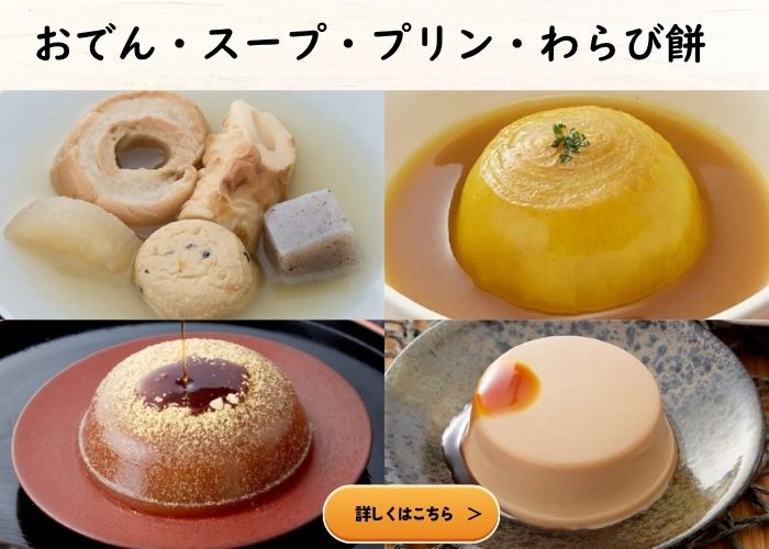また、こちらのメーカーではおでんやスープなど季節感を味わえる商品や、プリン・わらび餅などの甘味もお取り扱いがございます。