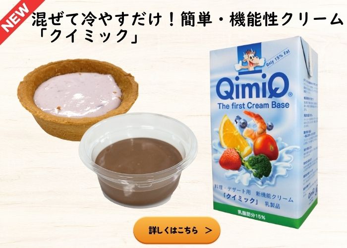 また、「クイミック」は混ぜて冷やすだけでプリンやムースが完成するゼラチン入りの機能性クリーム。果物や酸味素材にも強く、デザートだけでなく惣菜やソースベースにも幅広くご採用いただいております。