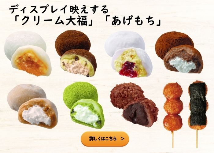 今回は、まるごと果実やクリームを贅沢に包んだ8種類のクリーム大福と、メニュー開発にも役立つモチソースの新商品をご紹介いたします。 クリーム大福は、冷凍販売用の一部商品を賞味期限間近の特価で販売しています。数量限定のためお早めにご検討ください。 ●まるごとみかん・まるごと渋皮栗 果汁たっぷりのみかんを白あんで包んだ「まるごとみかん」と、渋皮栗一粒をモンブランクリームで包んだ「まるごと渋皮栗」は、果実をまるごとあん・クリームで包み、さらにふわふわのおもちを重ねました。冷凍販売用・解凍後冷蔵販売用が選べます。 ※冷凍販売用は賞味期限1月28日までの商品に限り、数量限定の特価でご用意しています。 ●ごろっとモチクリーム(3種) ヨーグルトあんでマンゴーを包んだ「マンゴー」、白桃あんと白桃を包んだ「白桃」、チョコあんでバナナを包んだ「バナナ」の3種類。甘酸っぱい果実とあんをやわらかなおもちで包んでいます。冷凍販売用です。 ●純生クリーム大福(3種) 「粒あん」「抹茶」「さつまいも」の3種類のあんと、生クリームを合わせてやわらかなおもちで包み込んだ、なめらかな食感のクリーム大福です。冷凍販売用と解凍後冷蔵販売用が選べます。 ※「粒あん」の冷凍販売用は賞味期限1月28日までの商品に限り、数量限定の特価でご用意しています。 ●もちソース もち米粉のみで作られた、とろりとやわらかいお餅のソースです。お餅のやわらかさをそのままソースとして扱えるため、たこ焼きにソースとしてかけたり、デザートのトッピングにするなど、幅広い用途でご使用いただけます。 実際に某有名たこやき店でも期間限定メニューとして採用されており、“ちょっと変わった”メニュー提案におすすめです。 その他、同メーカーでは、和菓子・洋菓子店におすすめの売り場で映える商品を豊富に取り扱っております。 |