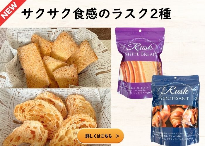 今回は、売店・冷凍販売店で導入しやすい8種類の「冷凍ケーキ」と、パッケージデザインにもこだわったさくさく食感の「ラスク」2種類をご紹介いたします。催事販売や期間限定ショップで冷凍販売を展開しているメーカーです。売場づくりに変化をつけたい方や、新たな定番商品をお探しの方におすすめです。冷凍ケーキは、特濃レアチーズケーキ、ムースショコラ、いちごムースの4号ホールケーキ3種をはじめ、表面を香ばしく炙ったカタラーナ、みみ付きプレミアムバニラロールなど全8種類をご用意しております。 冷凍販売用となりますので、冷凍販売店・冷凍ショーケースのある店舗様での導入におすすめです。 ホテルブレッドにバターとグラニュー糖を合わせたシュガーラスクと、大きめのクロワッサンをざく切りにした軽い食感のクロワッサンラスクの2種類をご用意。洋風でおしゃれなデザインのパッケージは売場でも目を引きやすく、レジ横などぱっと目につく場所での販売に最適です。 |