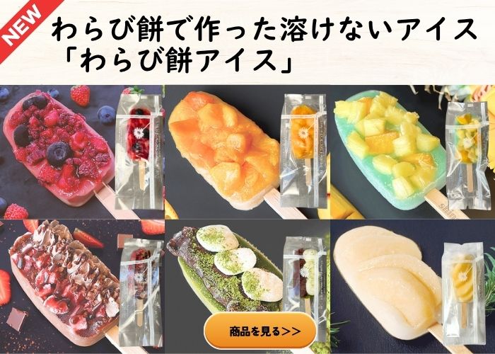 今回は、売場で思わず目を引く、「わらび餅アイス」をご紹介いたします。 “溶けないアイス”というキャッチーな特徴と、カラフルな見た目が特長の新感覚デザートで、冷凍ショーケースに並べるだけで売場に華やかさをプラスできます。 時間の経過とともに、アイスからわらび餅のようなもちっとした食感へと変化する新感覚デザート。本わらび粉と新潟県産米粉を使用しており、氷のように固くなりにくい点も特長です。 ベリーやマンゴーみかん、ラムネパイン、洋ナシ(ルレクチェ)、生チョコストロベリー、抹茶の全6種類。観光地や温浴施設、和菓子店などで展開しやすく、食べ歩き向けにも取り入れやすい商品です。 その他にも、カップからバルクまで、業態や販売方法に応じて選べるアイスを豊富に取り揃えております。 気になる商品がございましたら、各画像リンクより商品詳細をご確認いただけます。 売場のアクセントや季節商品の強化にも取り入れやすい内容となっておりますので、 これからの売場づくりにぜひお役立てください。 |