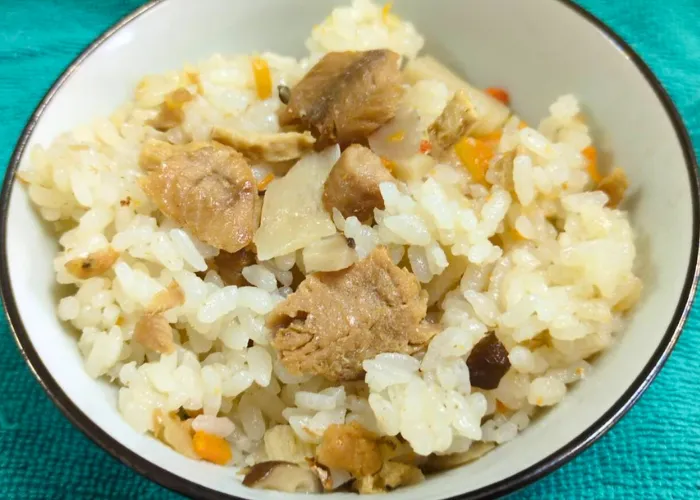 お米2合(180mlのカップ2杯)を研ぎ、2合炊きの目盛りより少し少ない水(300㏄)を入れてください。その後調味液を加え軽くかき混ぜます。具材は液ごと加え、軽くかき混ぜたあとに炊飯。