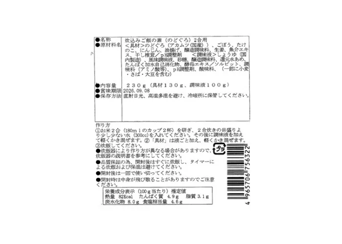原材料名 のどぐろ(アカムツ(国産))、ごぼう、たけのこ、にんじん、油揚げ、醸造調味料、生姜、魚介エキス、干し椎茸/ph調整剤 <調味液>しょうゆ(国内製造)、風味調味液、砂糖、醸造調味料、還元水あめ、たん白加水自己消化物、酵母エキス/ソルビット、調味料(アミノ酸等)、ph調整剤、酸味料、(一部に小麦・さば・大豆を含む)