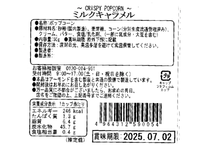| 原材料名 | 砂糖(国内製造)、麦芽糖、コーン(分別生産流通管理済み)、クリーム、バター、食塩 /乳化剤、(一部に乳成分・大豆を含む) |