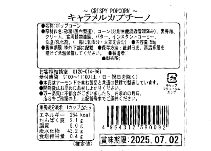 | 原材料名 | 砂糖(国内製造)、コーン(分別生産流通管理済み)、麦芽糖、クリーム、食用植物油脂、バター、インスタントコーヒー、食塩 /乳化剤、(一部に乳成分・大豆を含む) |