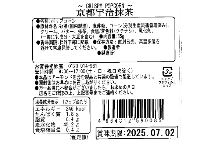 | 原材料名 | 砂糖(国内製造)、麦芽糖、コーン(分別生産流通管理済み)、クリーム、バター、抹茶、食塩 /着色料(クチナシ)、乳化剤、(一部に乳成分・大豆を含む) |