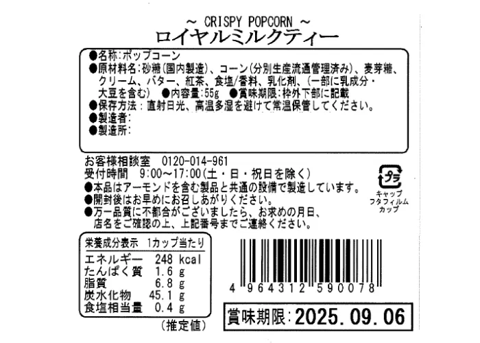 | 原材料名 | 砂糖(国内製造)、コーン(分別生産流通管理済み)、麦芽糖、クリーム、バター、紅茶、食塩 /香料、乳化剤、(一部に乳成分・大豆を含む) |