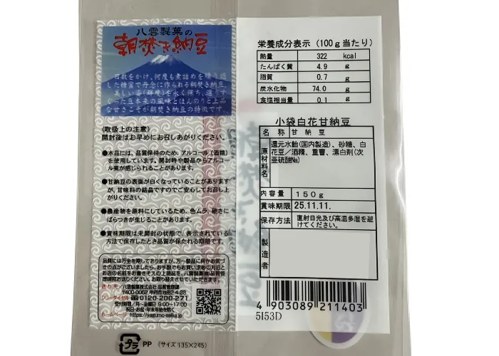原材料名 | 還元水飴(国内製造)、砂糖、白花豆/酒精、重曹、漂白剤(次亜硫酸Na) |