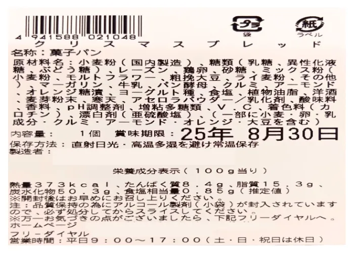| 原材料名 | z小麦粉(国内製造)、糖類(乳糖、異性化液糖、ぶどう糖)、レーズン、鶏卵、砂糖、ミックス粉(小麦粉、モルトフラワー、粗挽大豆、ライ麦粉、その他)、マーガリン、牛乳、パン酵母、クルミ、アーモンド、オレンジ糖漬、植物油脂、食塩、洋酒、麦芽粉末、寒天、アセロラパウダー/乳化剤、酸味料、香料、pH調整剤、増粘多糖類、V.C、着色料(カロチン)、漂白剤(亜硫酸塩)、(一部に小麦・卵・乳成分・クルミ・アーモンド・オレンジ・大豆を含む) |