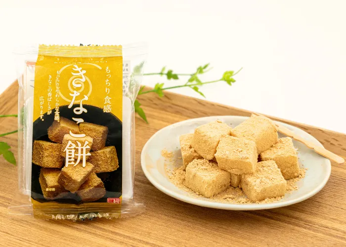 定番「きなこ餅」。常温で9ヶ月保存でき、ストックすればいつでも本格派。なめ らかな餅に添付のきな粉をかけ、お好みのタイミングでお召し上がりください。