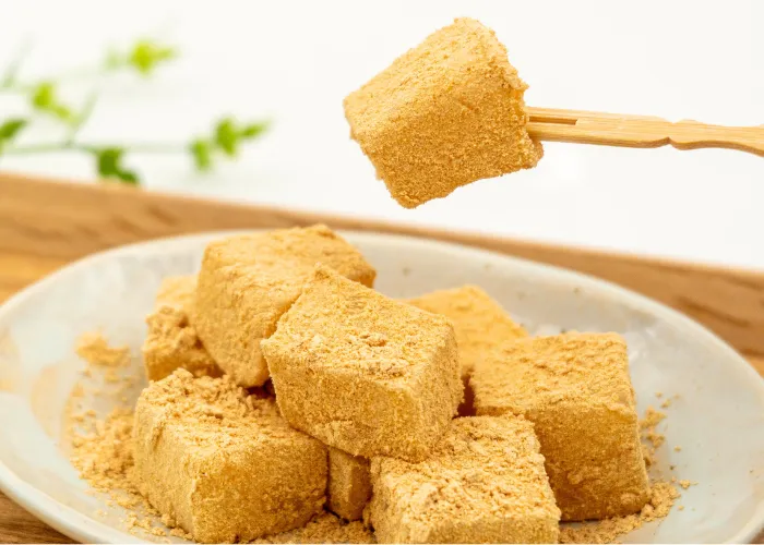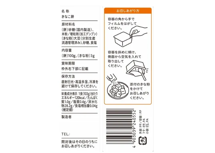 | 原材料名 | 【わらび餅】砂糖(国内製造)、米粉/増粘剤(加工デンプン)【きな粉】大豆(分別生産流通管理済み)、砂糖、食塩 |