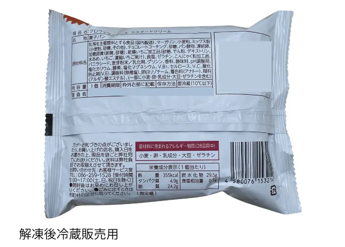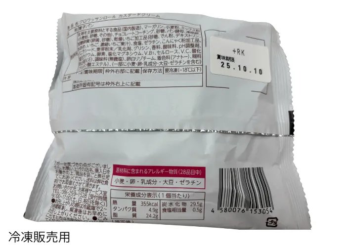 | <小売用>一括表示/賞味期限印字/JANコード印字 | <冷凍販売> 印刷済み/シール貼り付け済み/印刷済み <解凍後冷蔵販売> 印刷済み/なし/印刷済み |