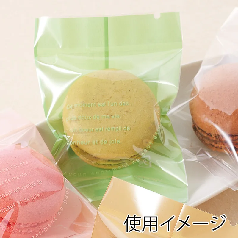 クッキー・マカロンに合わせた小さめサイズの個装用平袋です。背面にカラーベタを印刷しているので、お菓子をよりくっきり引き立たせます。開封用のVカット入り。