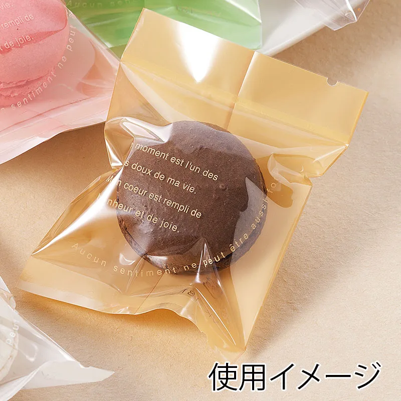 クッキー・マカロンに合わせた小さめサイズの個装用平袋です。背面にカラーベタを印刷しているので、お菓子をよりくっきり引き立たせます。開封用のVカット入り。