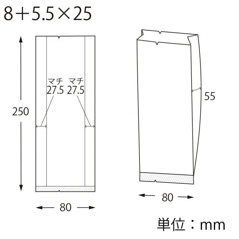 1個サイズ(入数)/寸法 | -/-/厚0.055×幅80/全体幅135×高250mm(マチ:55mm) |