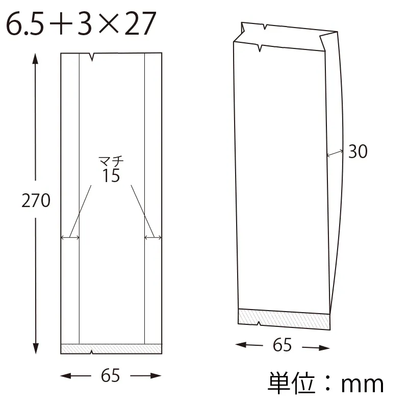 | 1個サイズ(入数)/寸法 | -/-/厚0.07×幅65/全体幅95×高270mm(マチ:30mm) |