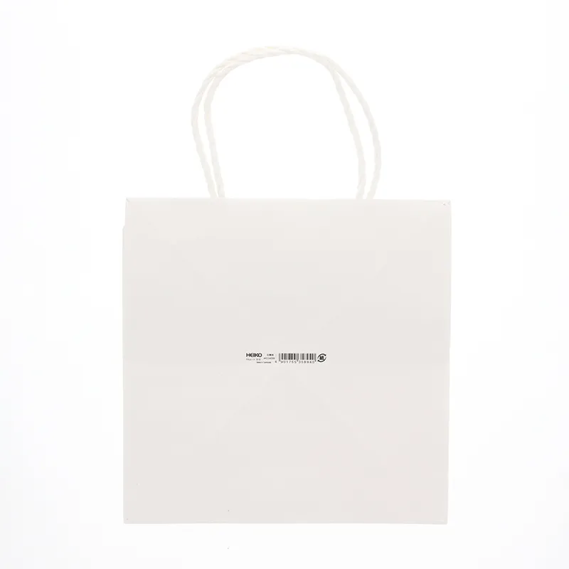 樹脂製の接着剤で手紐を取り付けた手提げ紙袋です。紐の結び目がなくすっきりし、物の出し入れがスムースで、ストックする際にかさばらないメリットがあります。マチを広めに設計していますので、箱もののお持ち帰りに適しています。汎用性の高い白無地。
