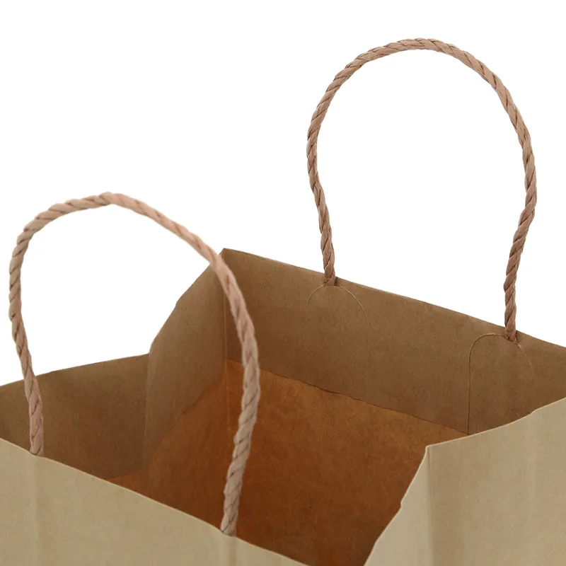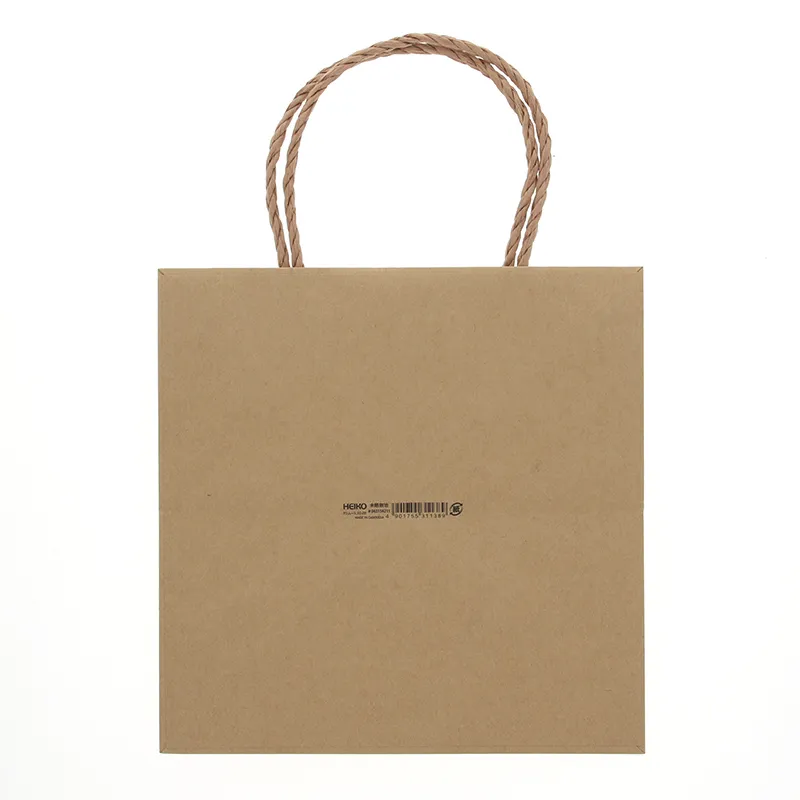 樹脂製の接着剤で手紐を取り付けた手提げ紙袋です。紐の結び目がなくすっきりし、物の出し入れがスムースで、ストックする際にかさばらないメリットがあります。マチが広く、底が正方形タイプですので、箱もののお持ち帰りに適しています。