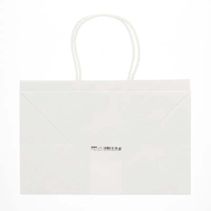 樹脂製の接着剤で手紐を取り付けた手提げ紙袋です。紐の結び目がなくすっきりし、物の出し入れがスムースで、ストックする際にかさばらないメリットがあります。マチを広めに設計していますので、箱もののお持ち帰りに適しています。汎用性の高い白無地。