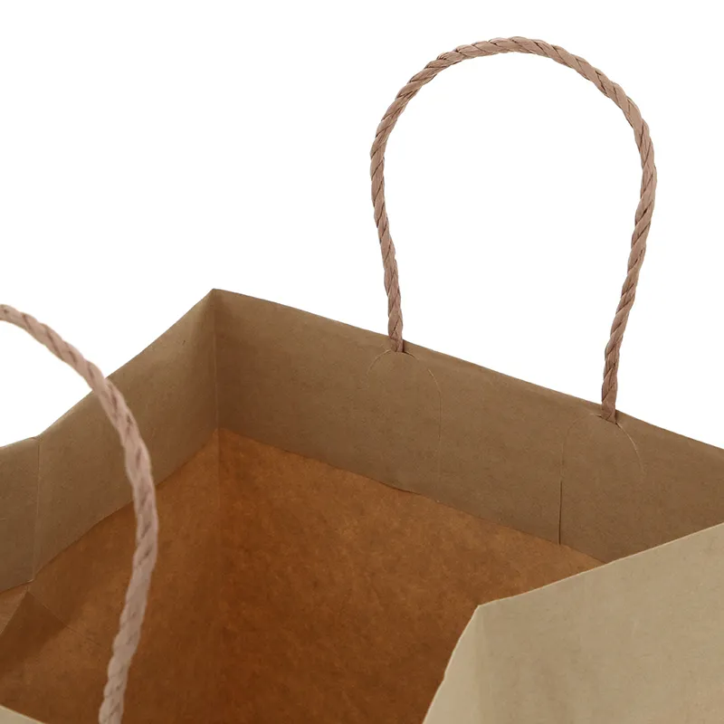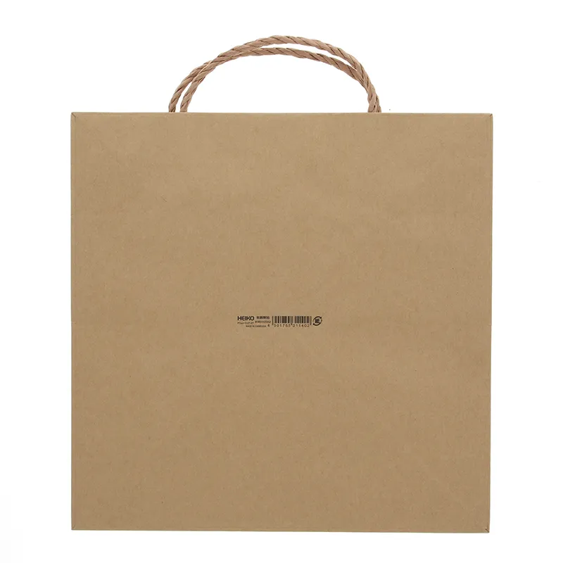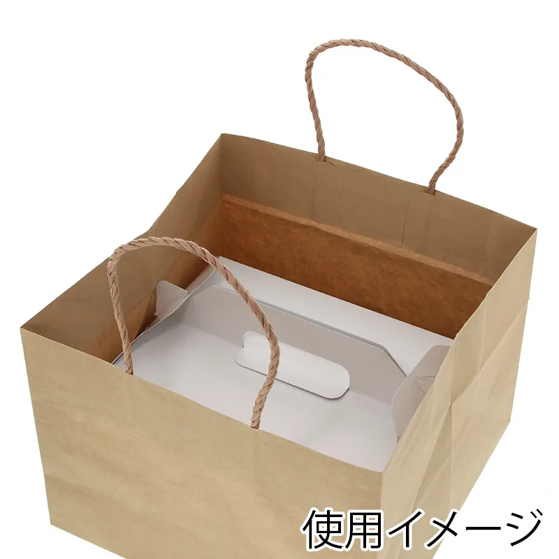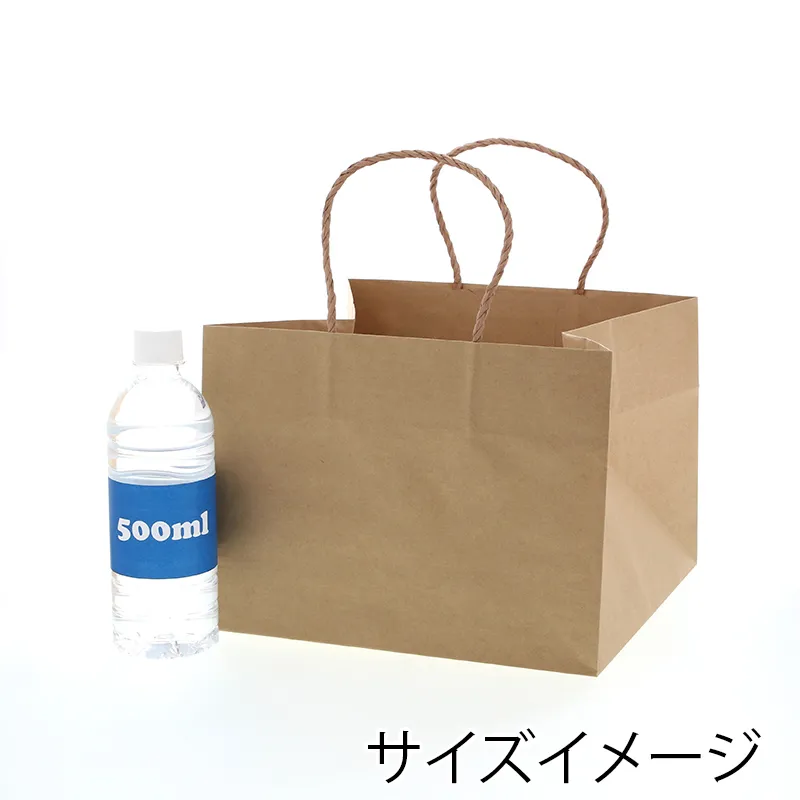 樹脂製の接着剤で手紐を取り付けた手提げ紙袋です。紐の結び目がなくすっきりし、物の出し入れがスムースで、ストックする際にかさばらないメリットがあります。マチがかなり広く、底が正方形タイプ。箱もののお持ち帰りに適しています。汎用性の高い未晒無地。