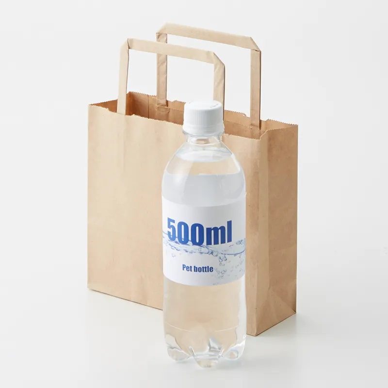 プレーンなクラフト紙の手提げ袋です。無地ものですので、さまざまな用途にご利用いただけます。25チャームバッグの中でも、容積が最小の規格です。紐は外に出た状態で包装してあります。