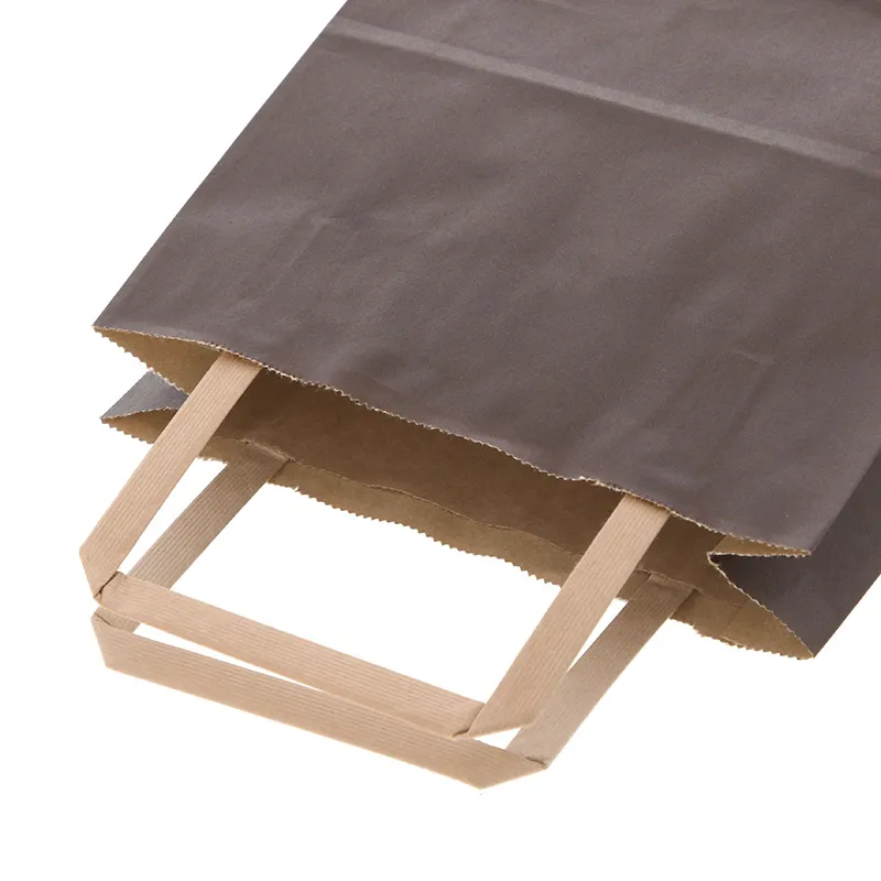 エレガントで上品な焦げ茶色の手提げ袋です。洋菓子などに。25チャームバッグの中でも、容積が最小の規格です。紐は外に出た状態で梱包してあります。