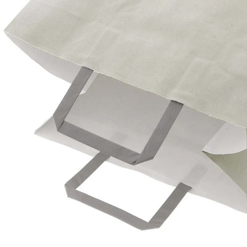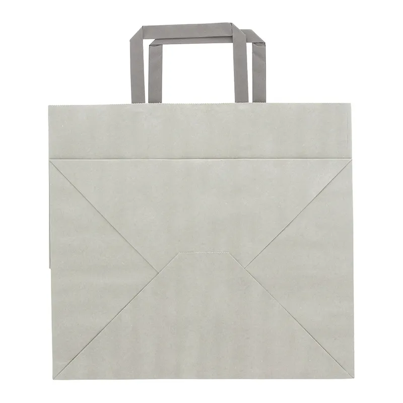 古紙含有率100%使用した環境に優しい手提げ紙袋です。ハンドルは一般的な平紐の幅10mm幅よりも太めの13mm幅を採用しているので、手にやさしく持ちやすいです。ホールケーキやバームクーヘンなどに対応したマチ広の袋です。