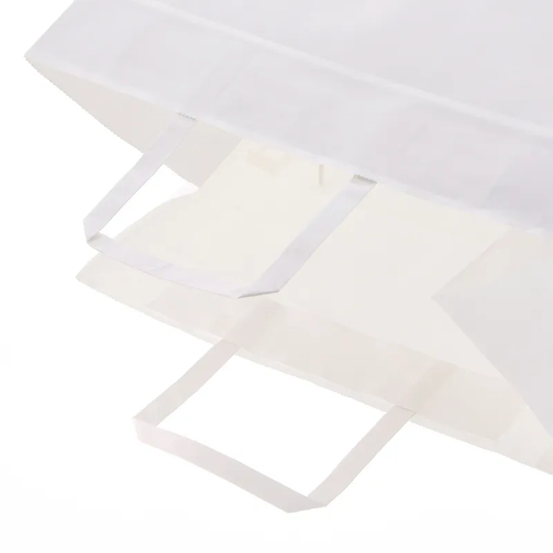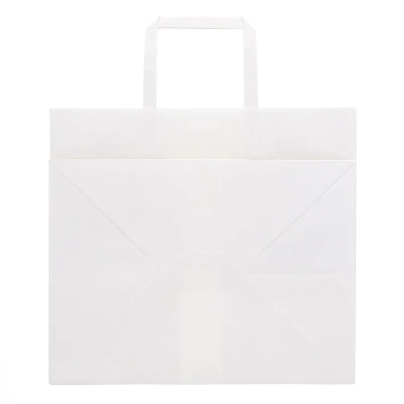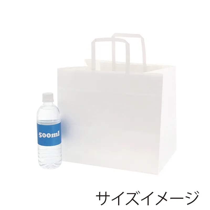ハンドルは一般的な平紐の幅10mm幅よりも太めの12mm幅を採用しているので、手にやさしく持ちやすい紙袋です。オーソドックスな白無地なので、催事など色々な用途でご使用頂けます。