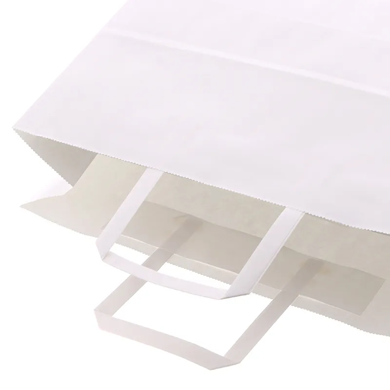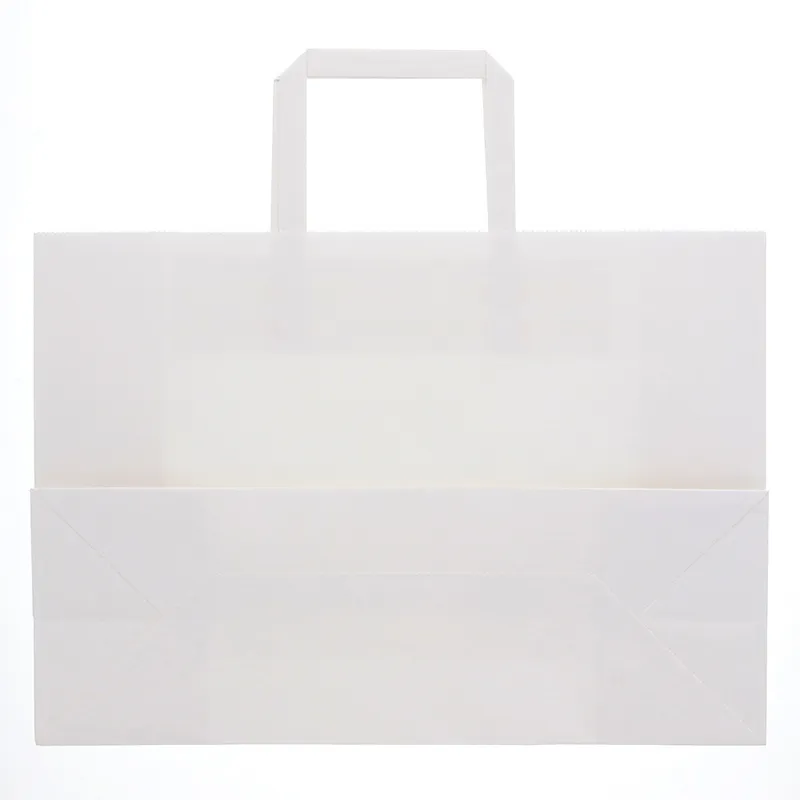 ハンドルは一般的な平紐の幅10mm幅よりも太めの12mm幅を採用しているので、手にやさしく持ちやすい紙袋です。オーソドックスな白無地なので、催事など色々な用途でご使用頂けます。