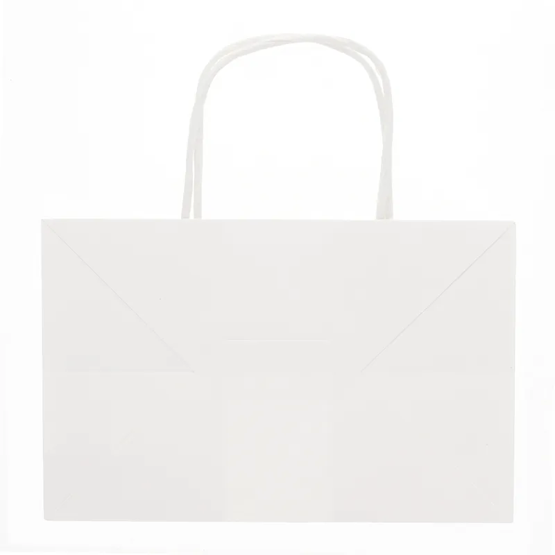 横長が特徴的でマチと高さが同サイズの白無地紙袋です。洋菓子、和菓子、土産、弁当など幅広い需要に、