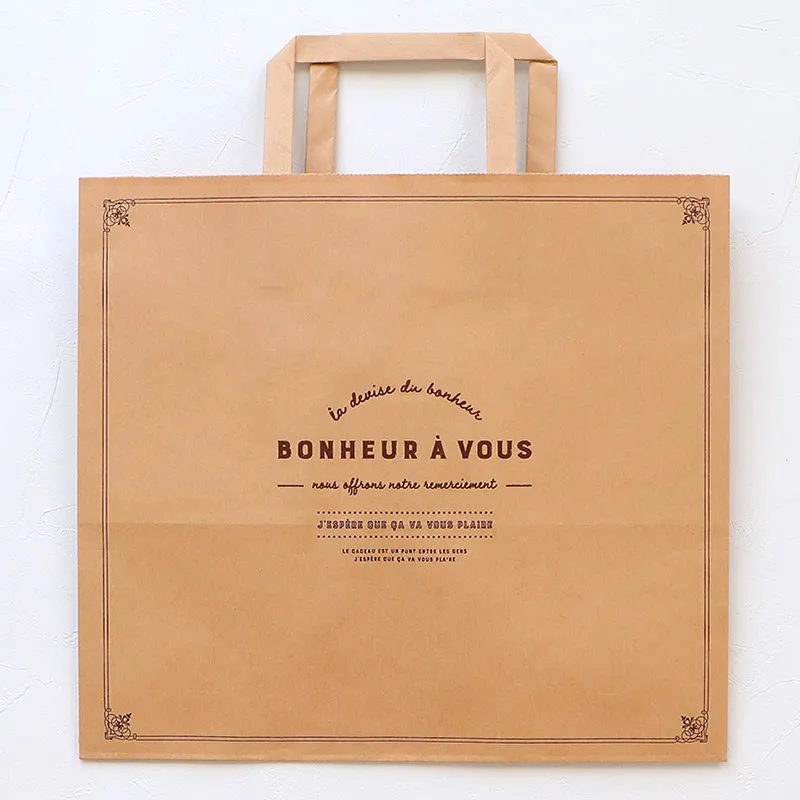 平紐タイプでマチが広い紙袋です。ナチュラルなクラフトカラー。「あなたに幸せが訪れますように」というメッセージが書かれています。シンプルで使いやすいデザインはシーンを選ばず、贈り物に最適です。底マチが広いのでデコレーションケーキ6号の箱が入ります。