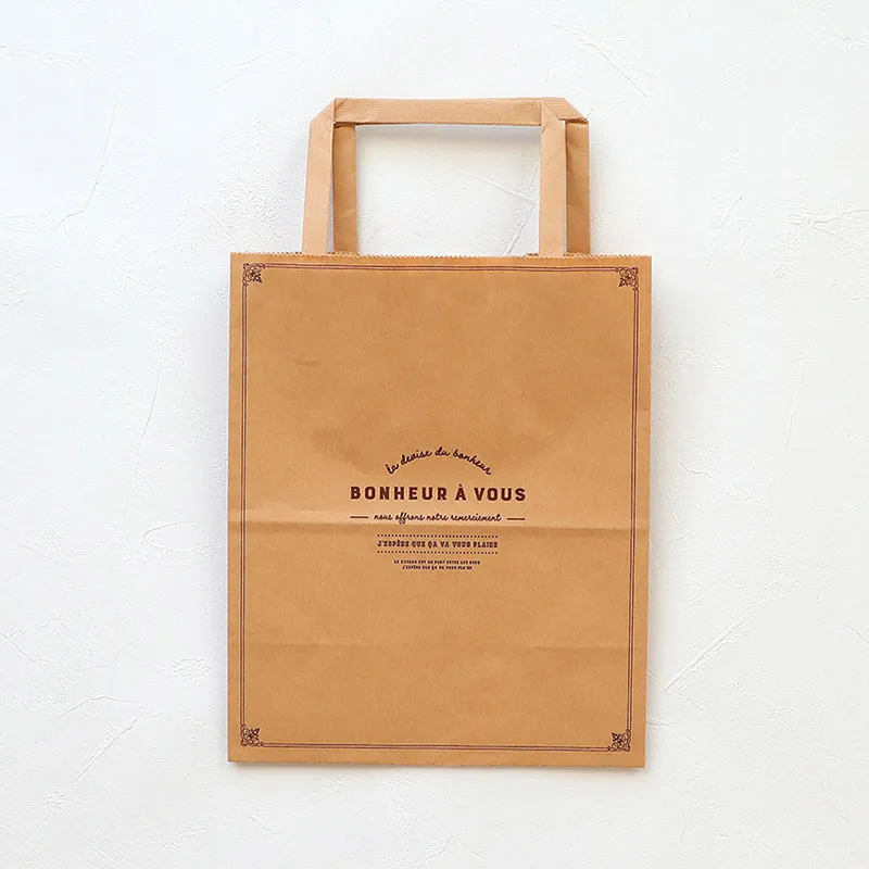 平紐タイプでマチが広い紙袋です。ナチュラルなクラフトカラー。「あなたに幸せが訪れますように」というメッセージが書かれています。シンプルで使いやすいデザインはシーンを選ばず、贈り物に最適です。少し小さめサイズなのでミニギフトにぴったり。
