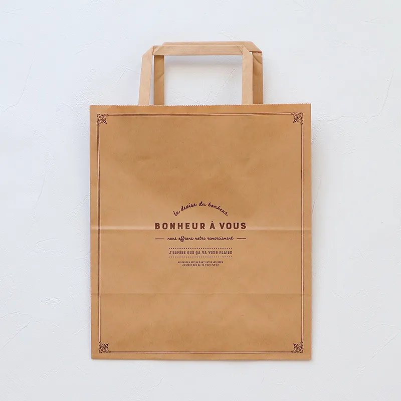 平紐タイプでマチが広い紙袋です。ナチュラルなクラフトカラー。「あなたに幸せが訪れますように」というメッセージが書かれています。シンプルで使いやすいデザインはシーンを選ばず、贈り物に最適です。焼き菓子の詰め合わせなどのギフトにぴったり。
