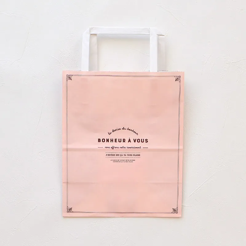 平紐タイプでマチが広い紙袋です。落ち着いたピンクカラー。「あなたに幸せが訪れますように」というメッセージが書かれています。シンプルで使いやすいデザインはシーンを選ばず、贈り物に最適です。少し小さめサイズなのでミニギフトにぴったり。