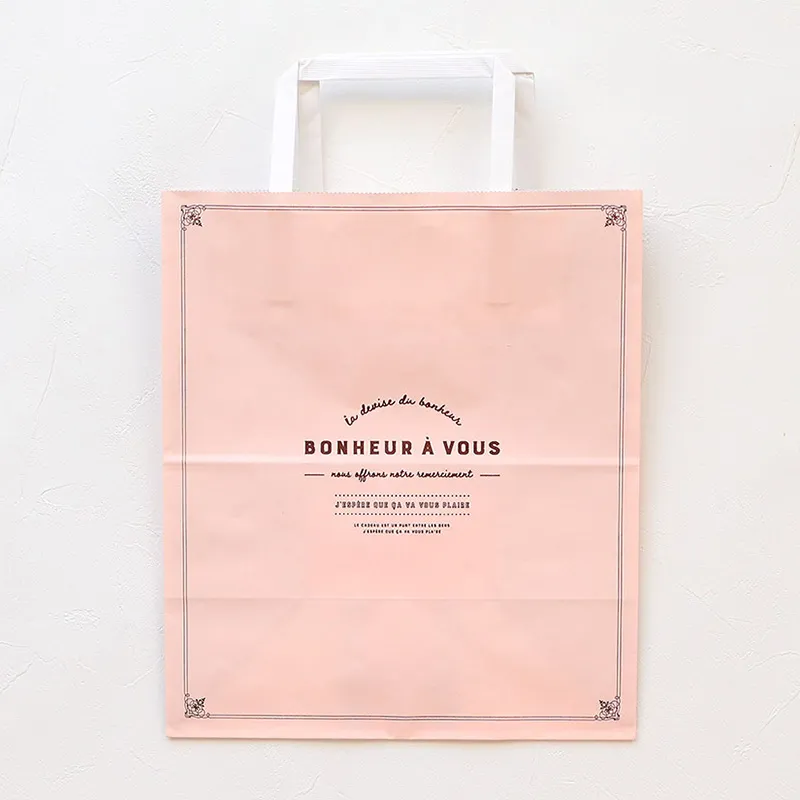 平紐タイプでマチが広い紙袋です。落ち着いたピンクカラー。「あなたに幸せが訪れますように」というメッセージが書かれています。シンプルで使いやすいデザインはシーンを選ばず、贈り物に最適です。焼き菓子の詰め合わせなどのギフトにぴったり。