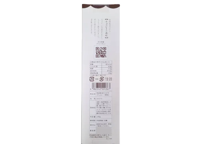 原材料名 | 鶏卵(長崎県産)、上白糖、小麦粉、グラニュー糖、水飴、準チョコレート、ザラメ糖、液糖、カラメルソース/トレハロース、乳化剤(大豆由来)、香料、酸化防止剤(V.E、V.C) |
