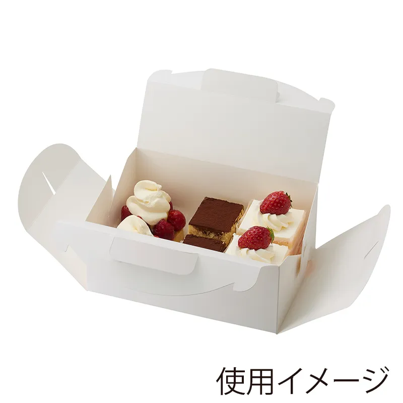 取っ手部分がアーチ型で持ちやすいキャリータイプのケーキ箱です。シンプルなホワイトカラー。組み立て式で在庫スペースの削減に貢献します。カットケーキ6~7個が目安です。