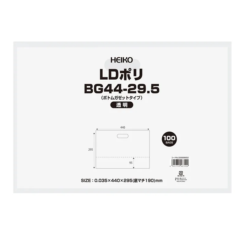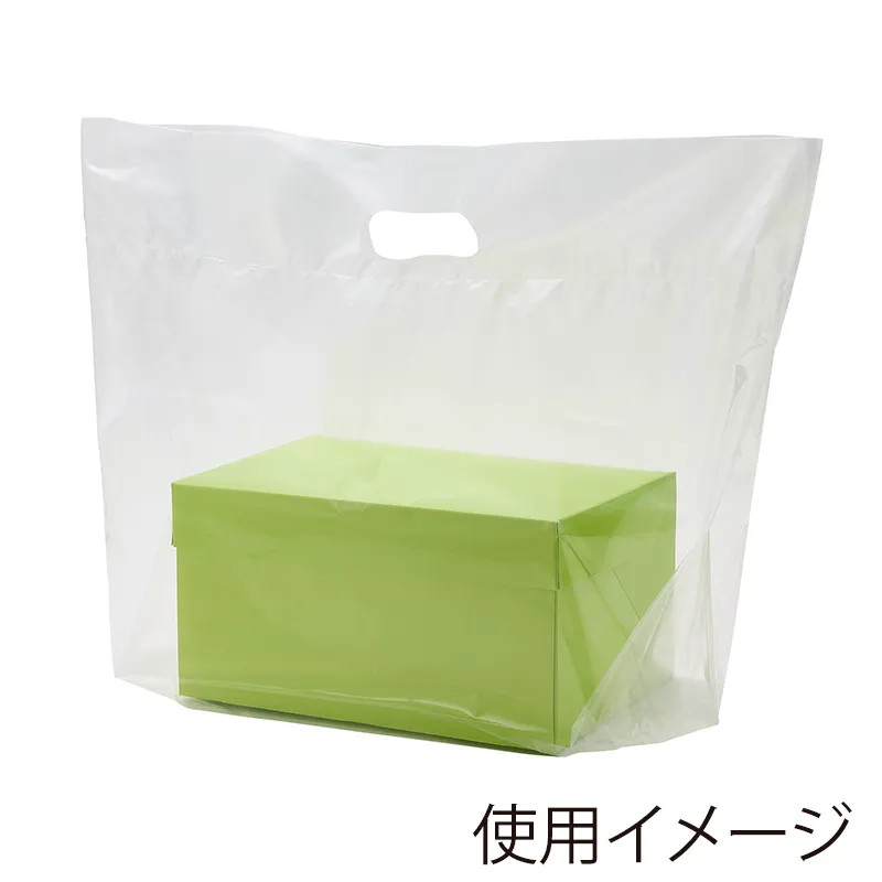 LDポリエチレンを使用したソフトタイプの手抜き袋です。中身が映えるスタイリッシュな透明タイプです。底マチが広いため、洋菓子の箱や食パンなどを入れるのに適しています。※穴から下の高さは多少前後する場合があります。