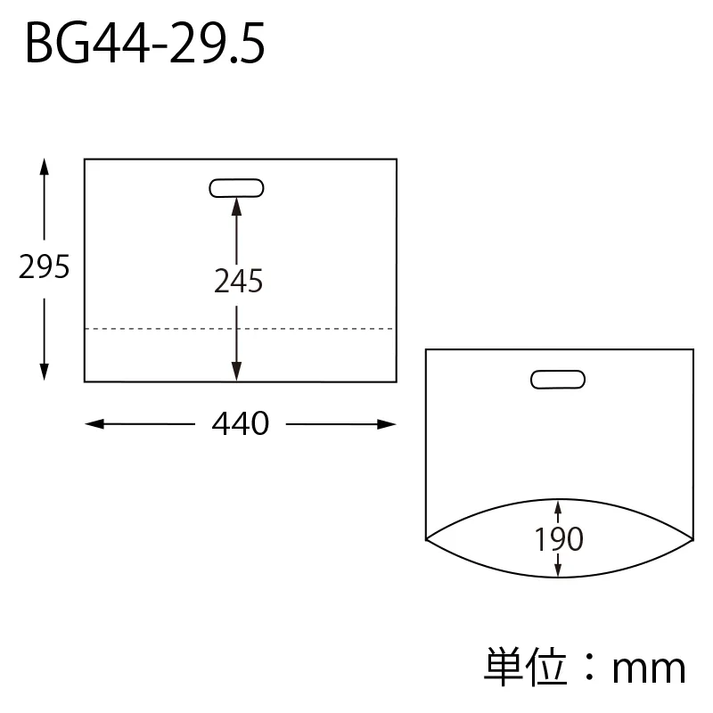 | 1個サイズ(入数)/寸法 | -/-/厚0.035×幅440×高295(底マチ190)mm/穴から下の高さ:245mm |