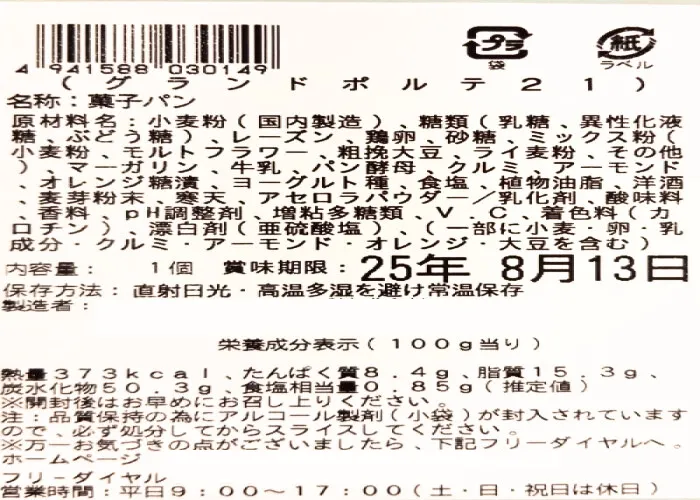 原材料名 | 小麦粉(国内製造)、糖類(乳糖、異性化液糖、ぶどう糖)、レーズン、鶏卵、砂糖、ミックス粉(小麦粉、モルトフラワー、粗挽大豆、ライ麦粉、その他)、マーガリン、牛乳、パン酵母、クルミ、アーモンド、オレンジ糖漬、ヨーグルト種、食塩、植物油脂、洋酒、麦芽粉末、寒天、アセロラパウダー/乳化剤、酸味料、香料、pH調整剤、増粘多糖類、V.C、着色料(カロチン)、漂白剤(亜硫酸塩)、(一部に小麦・卵・乳成分・クルミ・アーモンド・オレンジ・大豆を含む) |