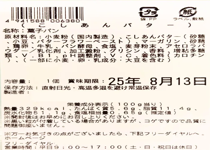 原材料名 | 小麦粉(国内製造)、こしあんバター(砂糖、小豆、バターフラワーペースト)、マーガリン、砂糖、鶏卵、牛乳、パン酵母、食塩、麦芽粉末、アセロラパウダー/乳化剤、加工澱粉、グリシン、香料、増粘多糖類、V.B1、pH調整剤、V.C、着色料(カロチン)、(一部に小麦・卵・乳成分・大豆を含む) |